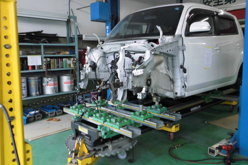 フレーム修正機の最高峰。自動車メーカーも認めた最新マシン(グローバルジグ)でボディーの修正を1mm単位で正確に修復。